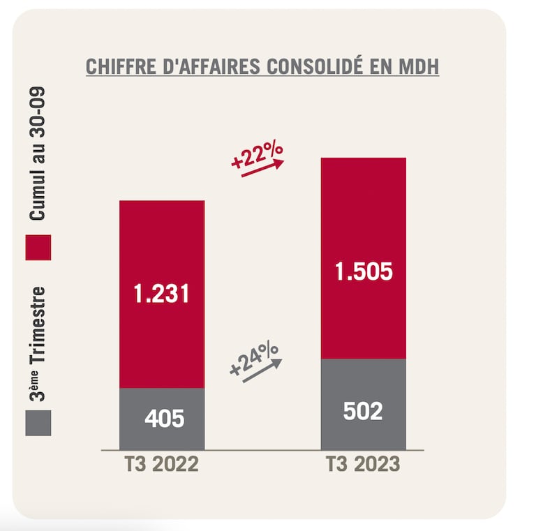 Le chiffre d’affaires consolidé du groupe Alliances au 30 septembre 2023 est de 1,505 milliard de dirhams contre 1,231 milliard de dirhams au 30 septembre 2022, en croissance de 22%. Au troisième trimestre 2023, le chiffre d’affaires consolidé s’établit à 502 millions de dirhams, en progression de 24% par rapport à la même période de l’année précédente.