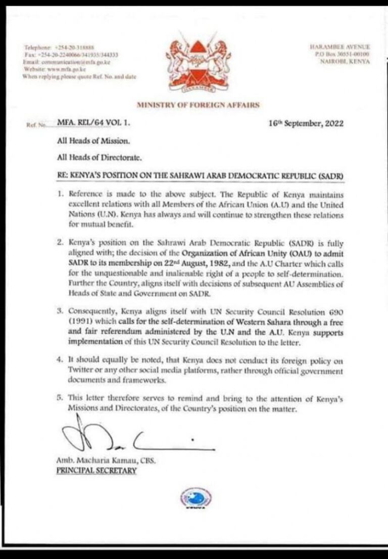 Comme motivée par la force du désespoir, la junte a retenté un coup bas en activant ses relais hérités de l’ancien régime au Kenya. Profitant d’une période de transition durant laquelle le gouvernement kényan n’a pas encore été nommé, le régime algérien a eu recours au secrétaire général du ministère kényan des Affaires étrangères, Macharia Kamau, sur le départ, et qui a produit une note interne, diffusée vendredi 16 septembre 2022 par les médias affiliés à la junte algérienne et transformée pour l’occasion en «communiqué du ministère des Affaires étrangères kényan».